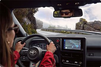 Žena řídí Toyotu po úzké horské silnici.